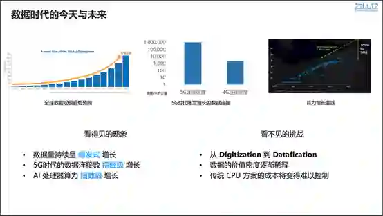 随着时代的发展,全球数据规模呈现指数级增长,伴随5G的到来,还会有更大更密的数据连接,在算力层面,GPU架构会超过CPU。