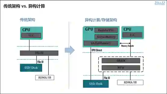 那么传统架构和异构计算有什么区别呢?对传统架构来说,一般都是从外存加载到内存再加载到CPU的缓存进行就算,对异构计算来说,可以从磁盘直接把数据加载到GPU的显存里,通过CPU和GPU的联手,让其更好地发挥算力,进而将之前在CPU上很难处理或无法处理的工作,进行有效的提升和加速。这就是我们产品设计的最核心的思想和架构。
