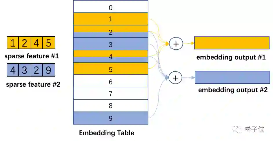 首先,在嵌入表中对每个特征查找Embedding Table对应的行,然后通过规约操作,比如max,mean, sum操作,变成一个特征向量,传递给后续的稠密神经网络。
