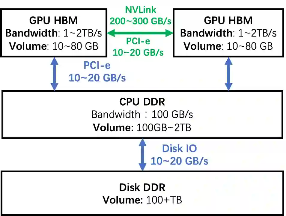 根据下图展示的GPU集群的内存层级图为例,让我们来分析几种常见方案的优劣。