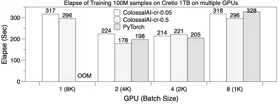 PyTorch由于显存内存不足无法在单卡A100上训练。作为对比, Colossal-AI的软件cache将显著降低GPU内存需求,足以训练大至256GB的嵌入表,并可进一步扩展至TB级别。