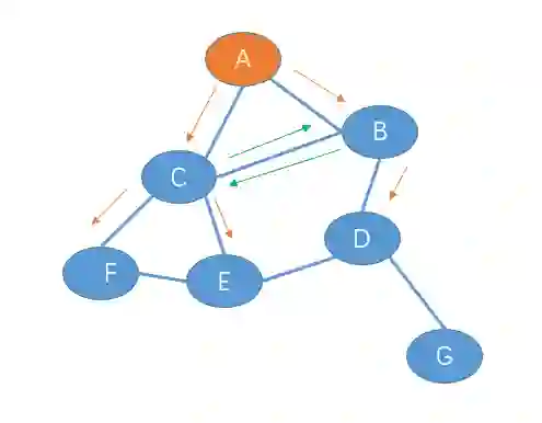 如果节点 A 要做一个广播,那么 A 就会给其邻居节点 B、C 发一份广播分组,B、C 也会给其的邻居节点发送一个广播分组。意味着 B 会给 C、D 发送广播分组,而 C 也会给 B、E、F 发送一份广播分组: