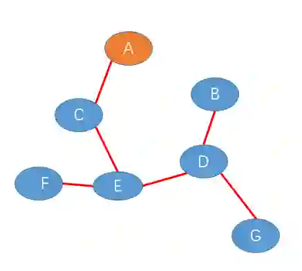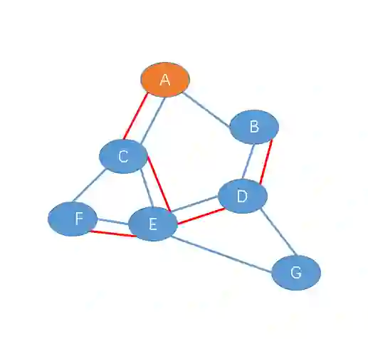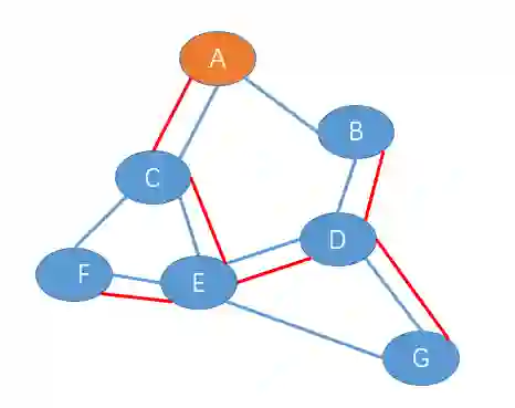 1. F 节点给 E 发送加入树报文,此时 E-F 链路成为初始生成树,如下图(红色路径表示生成树)。
