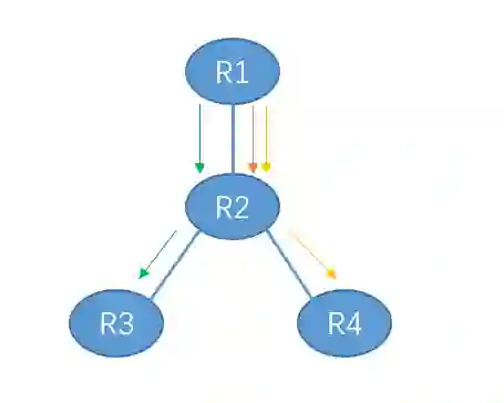 途中不同箭头的颜色表示 R1 给不同的节点发广播分组。