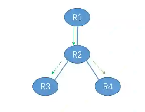 按照刚才的方法,R1 会给 R2 发送广播分组,接着 R2 会给 R3、R4 发送广播分组。刚才我们说过,收到广播分组的节点会给它的所有邻居发送报文(除了从其接受到该报文的那个邻居)。