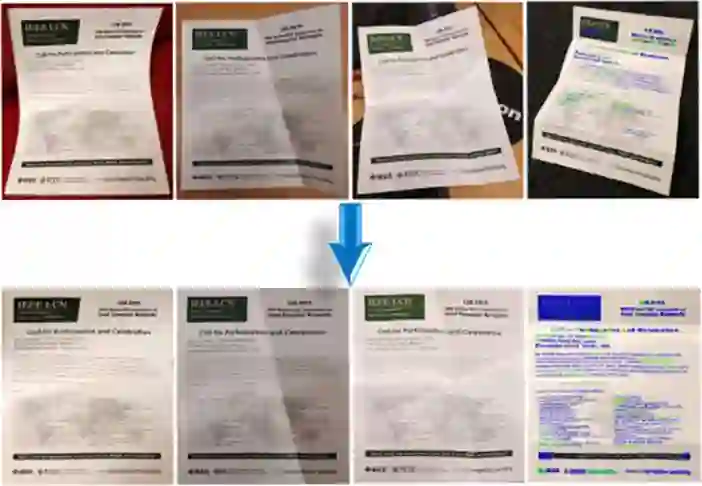 纸质文档在我们生活中十分重要且常见,上面具有丰富的信息。而数字文档则易于存储、传播以及检索。如今移动摄像头拍摄文档图像是方便且常见的文档数字化方法,但得到的图像由于纸张的物理形变、相机拍摄角度和光照条件多变的原因,不利于自动化信息提取和内容分析。有的研究通过低维的模型来对文档的形变进行建模,这是较难实现的;还有的研究直接假定一个网格(Mesh)对形变图像进行表征,然后直接预测网格上每个顶点对应于输出图像的位置,但很多都需要额外的硬件设备或多角度图像,而且计算量大且费时。近期的研究[1]中虽然提出了更快的方法,但由于训练数据只包含2维形变信息,所以对真实图片测试效果不鲁棒。
