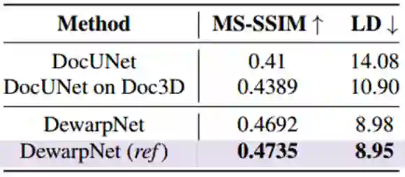 表1中DocUNet和DocUNet on Doc3D 分别代表DocUNet在原数据集和在Doc3D上训练出来的模型;DewarpNet和DewarpNet (ref)分别代表不包含和包含后处理。可以看到本文模型在该Benchmark[1]下的MM-SSIM 和 LD指标都取得了State‑of‑the‑art的结果,同时也证明了数据集Doc3D的有效性。为进一步探究,作者把[1]的Benchmark按照难度分为了a~f 6类,由a到f,难度依次增加,结果展示在图5中。前5类中本文模型都优于DocUNet,最难的f中本文模型取得了与DocUNet相近和稍好一点结果。