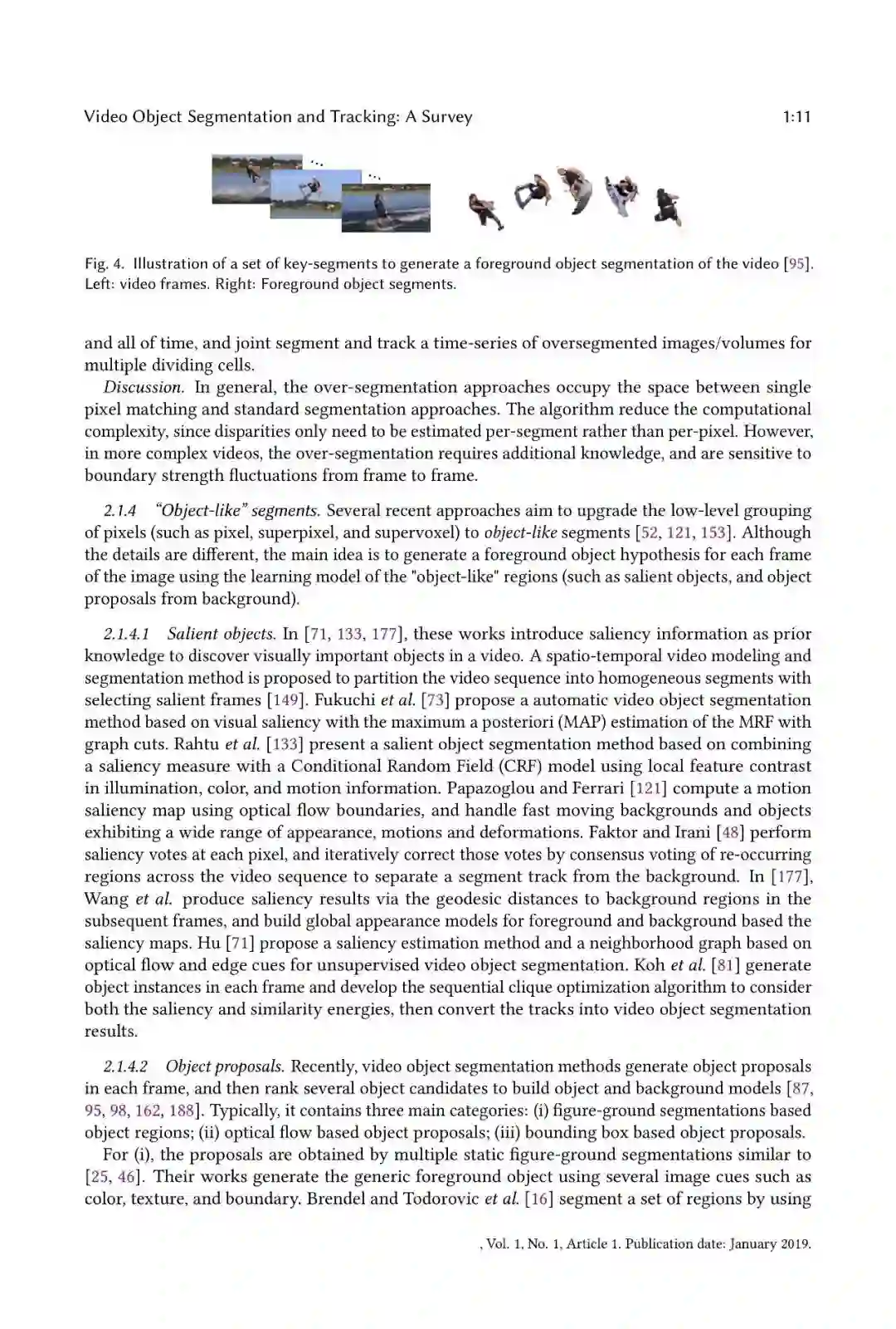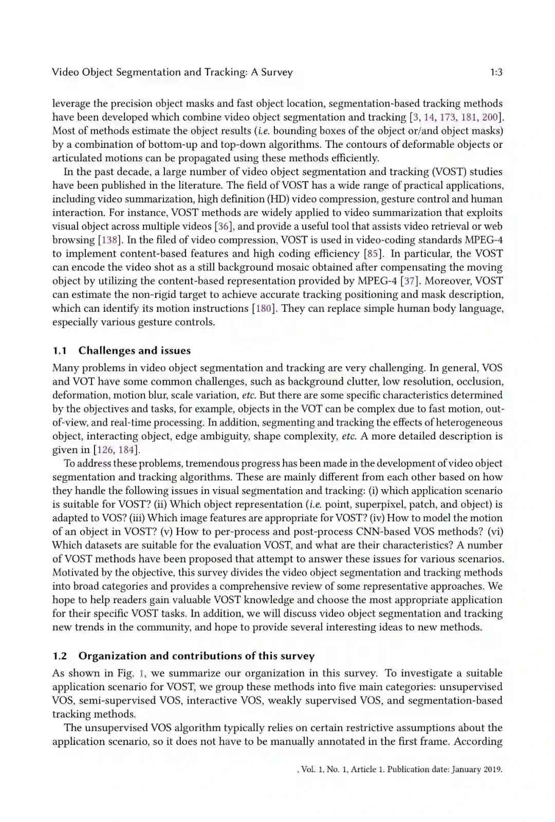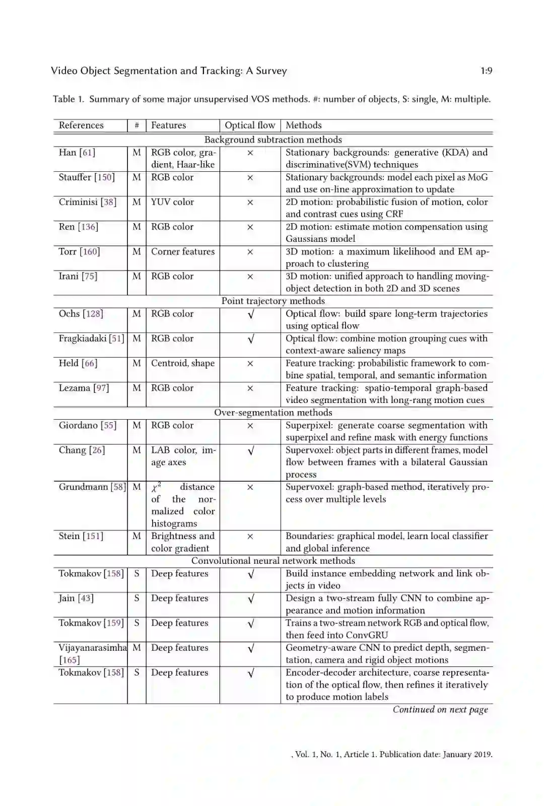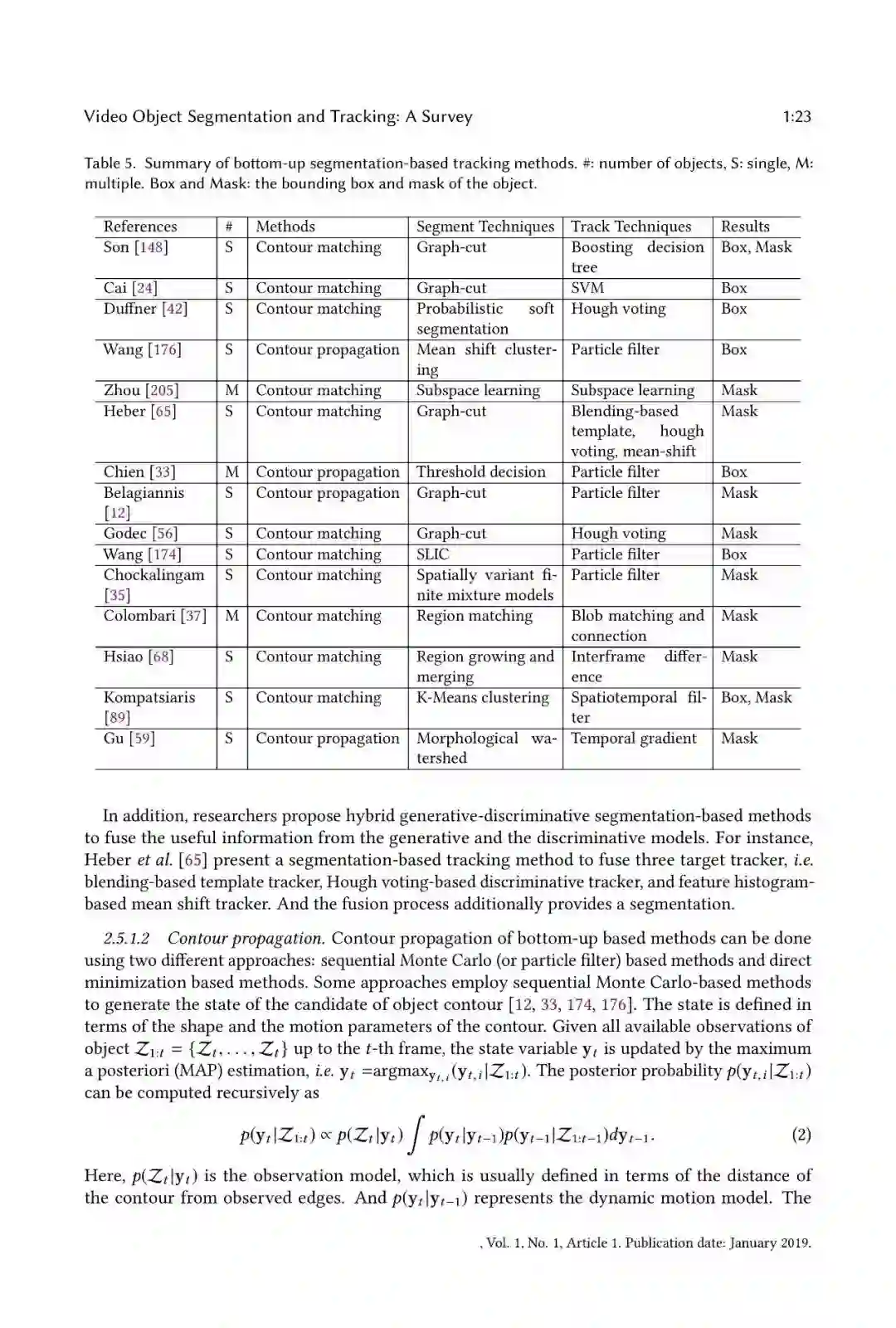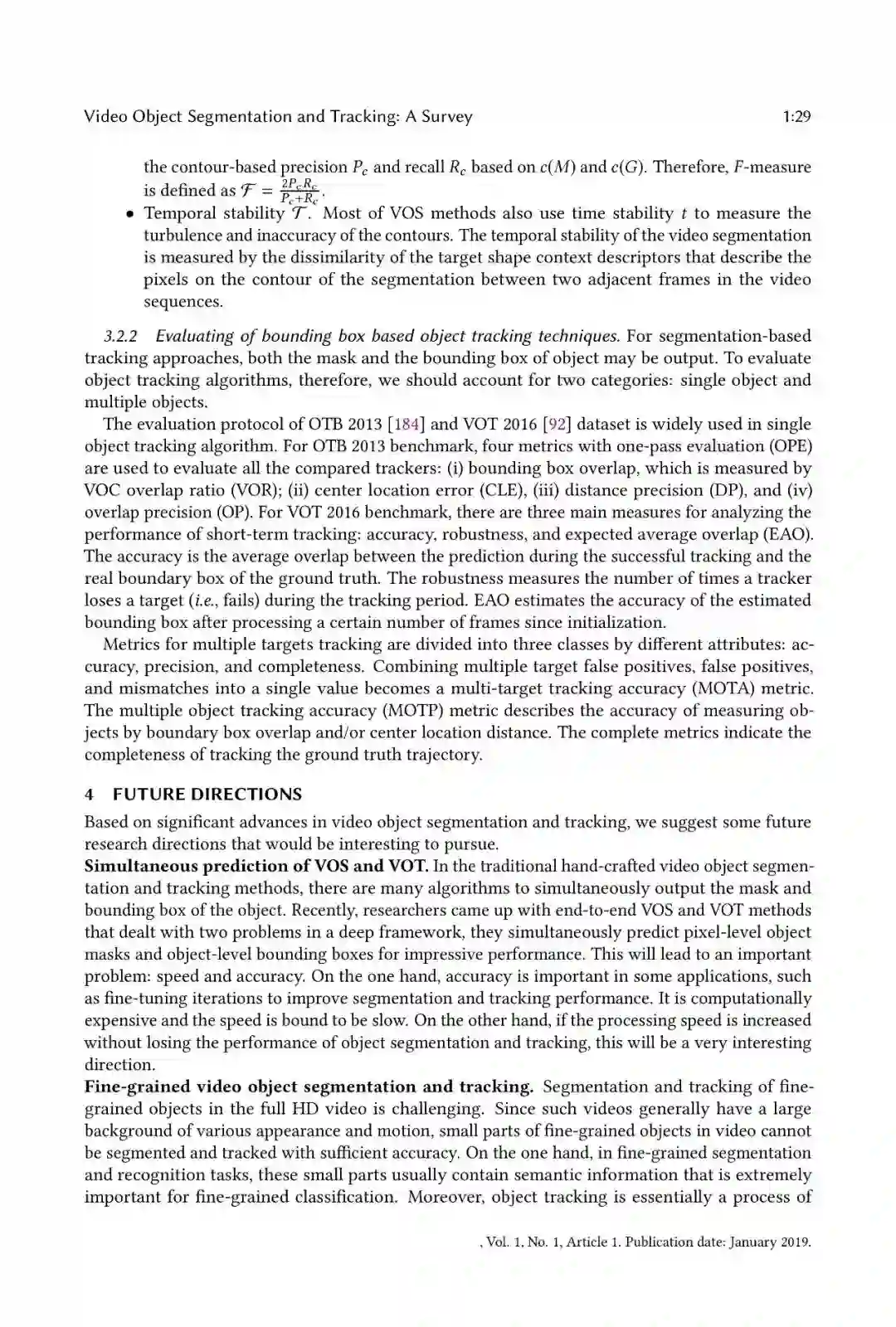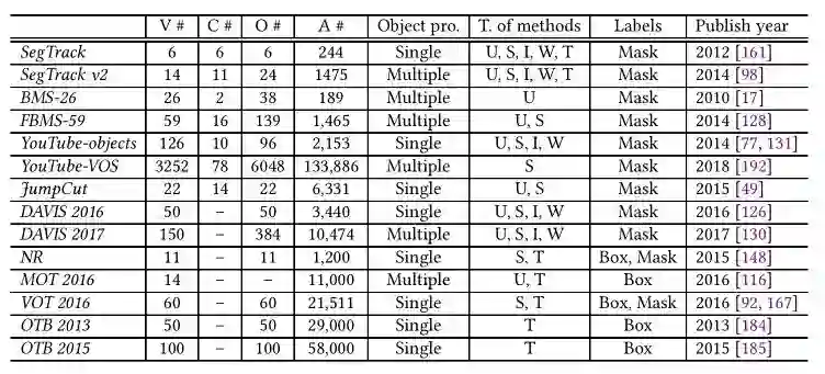在本文中,我们首先提供了现有的分类法,包括无监督视频对象分割、半监督视频对象分割、基于分段的跟踪方法等;其次,我们讨论了不同技术方法,并总结了相关视频数据集,同时整理了各种评估指标;最后,讨论了此类任务未来的发展方向。