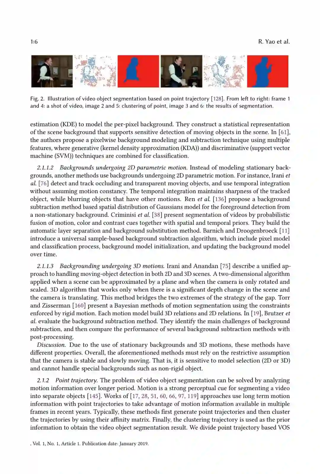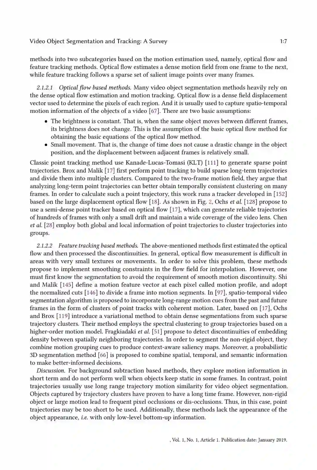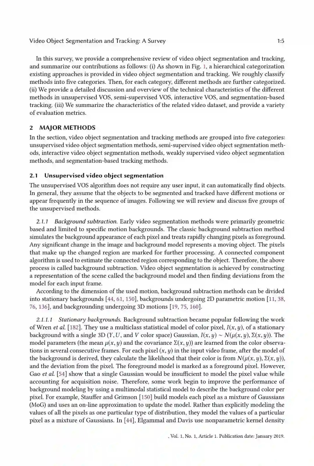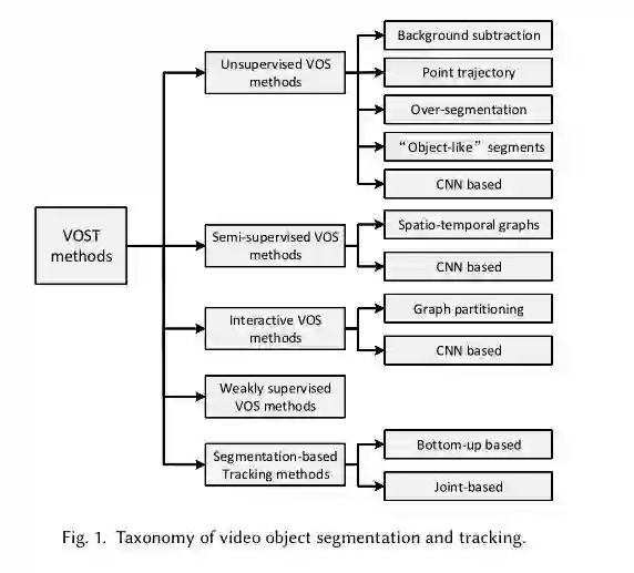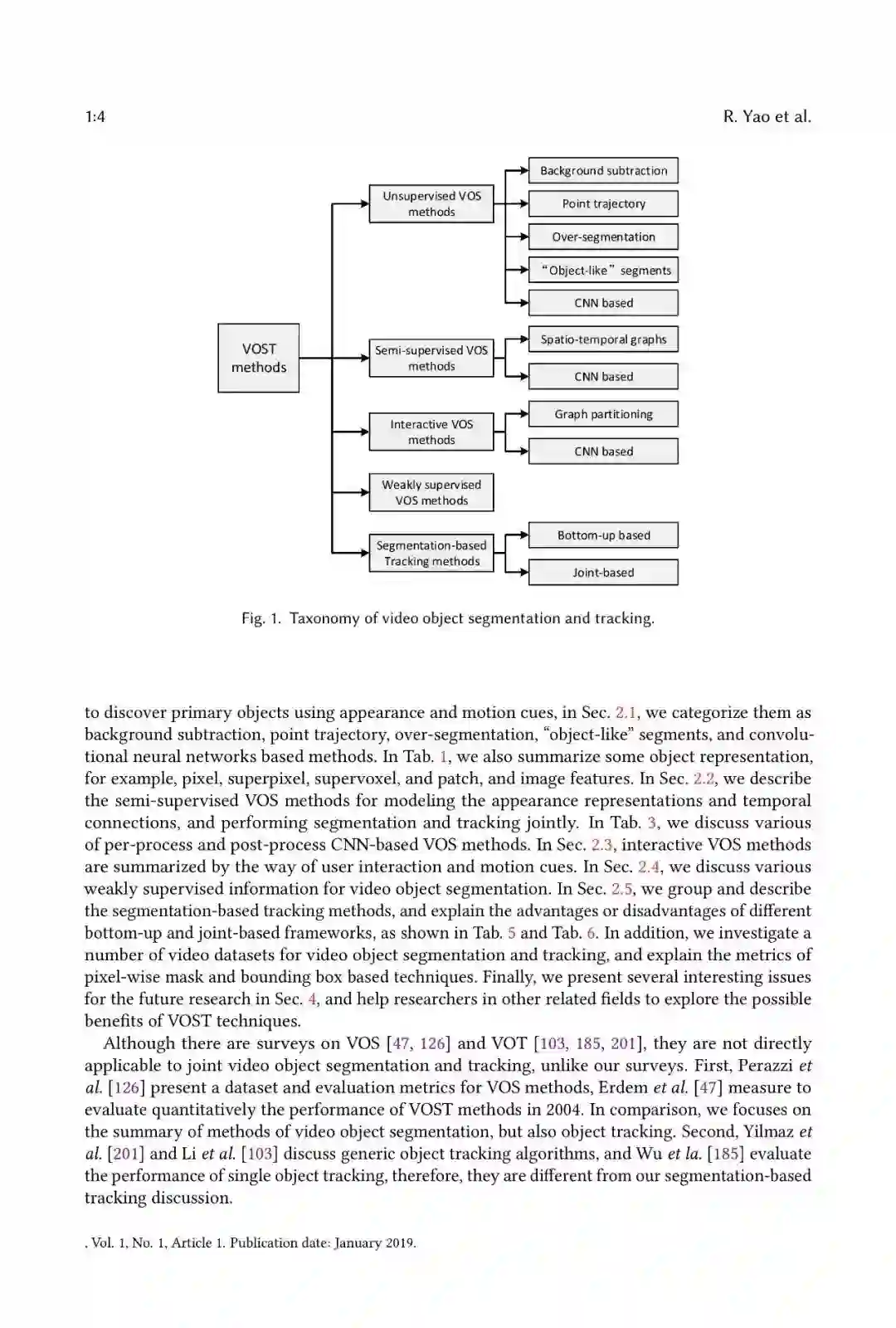 在本文中,我们首先提供了现有的分类法,包括无监督视频对象分割、半监督视频对象分割、基于分段的跟踪方法等;其次,我们讨论了不同技术方法,并总结了相关视频数据集,同时整理了各种评估指标;最后,讨论了此类任务未来的发展方向。