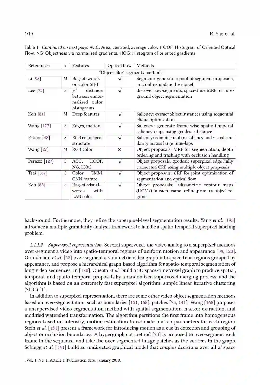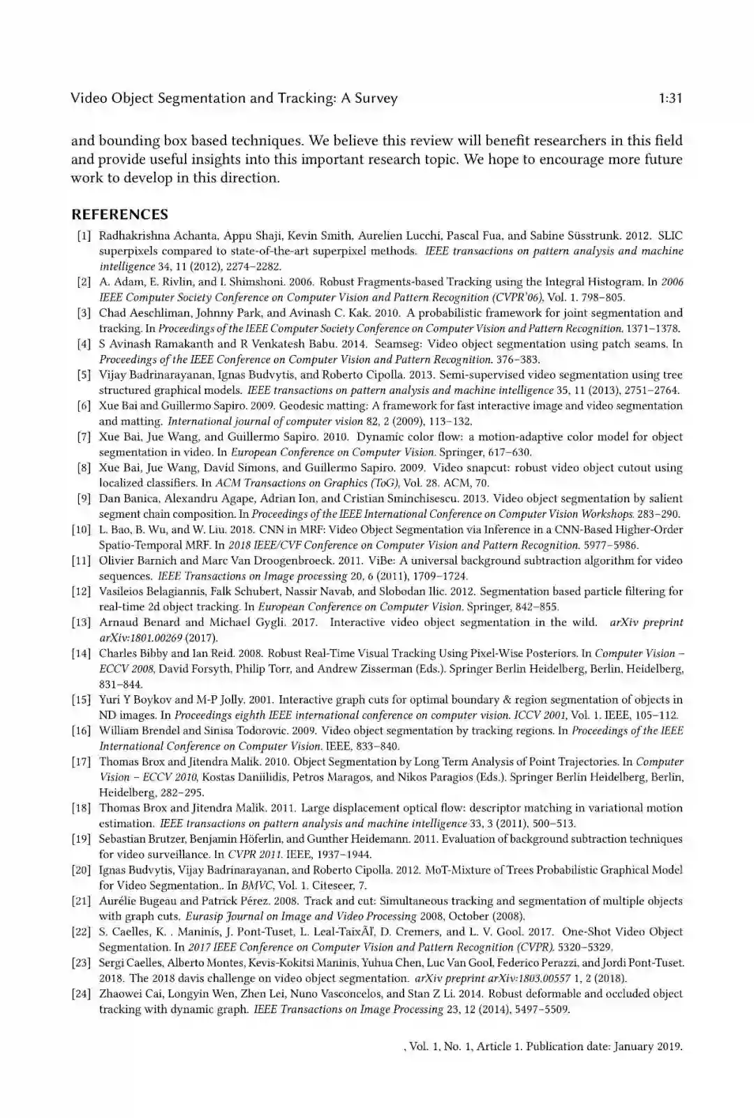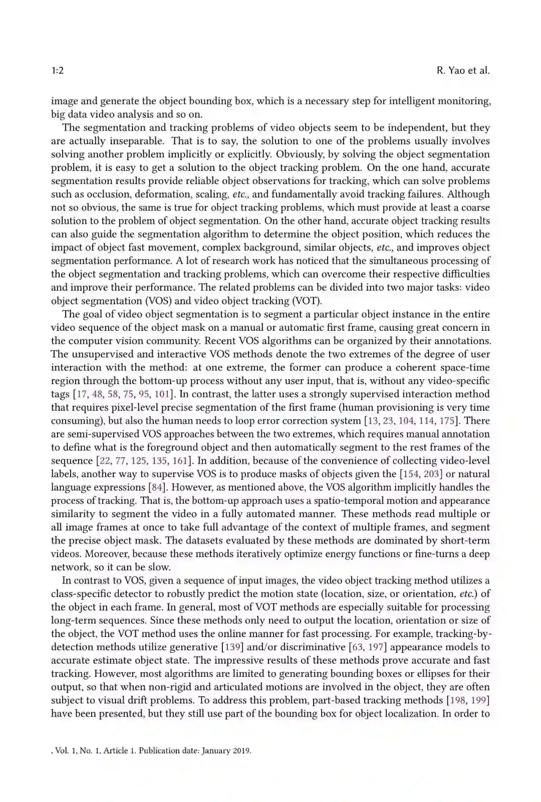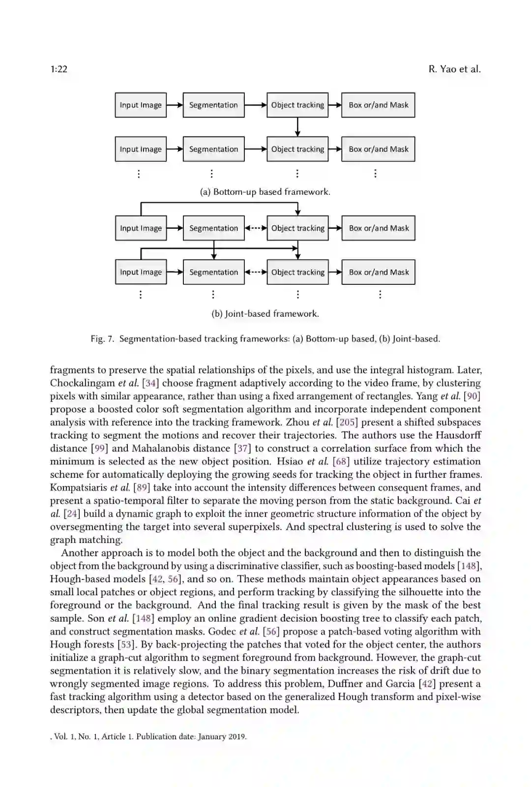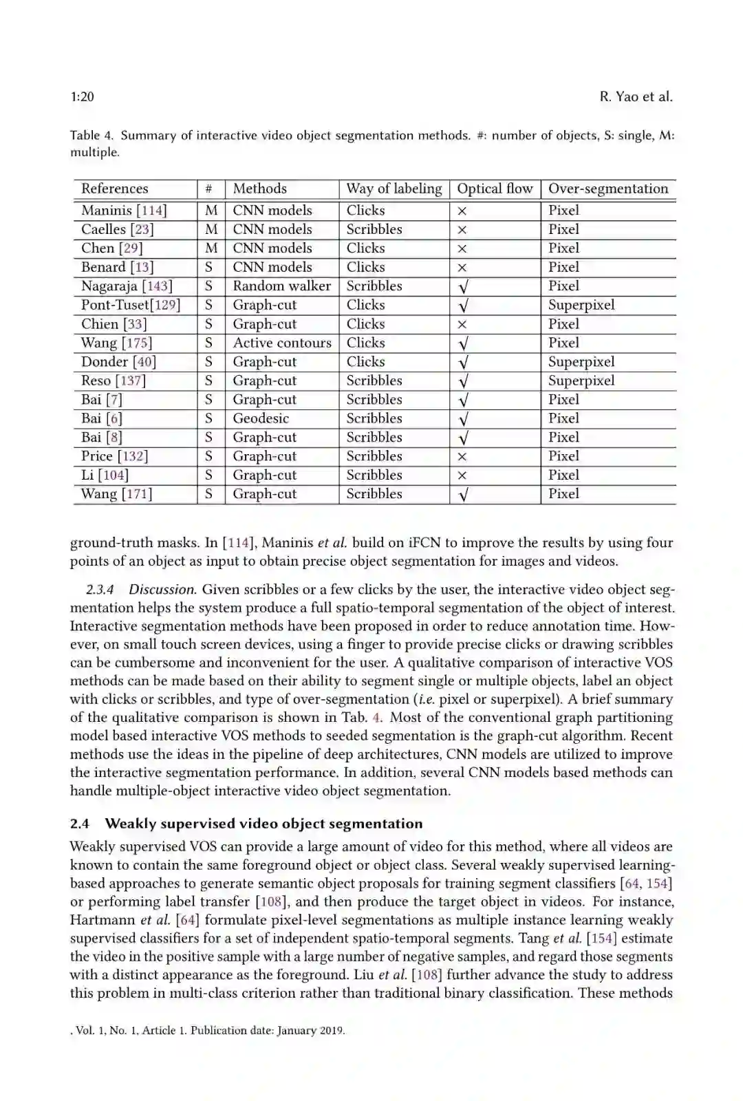在本文中,我们首先提供了现有的分类法,包括无监督视频对象分割、半监督视频对象分割、基于分段的跟踪方法等;其次,我们讨论了不同技术方法,并总结了相关视频数据集,同时整理了各种评估指标;最后,讨论了此类任务未来的发展方向。
