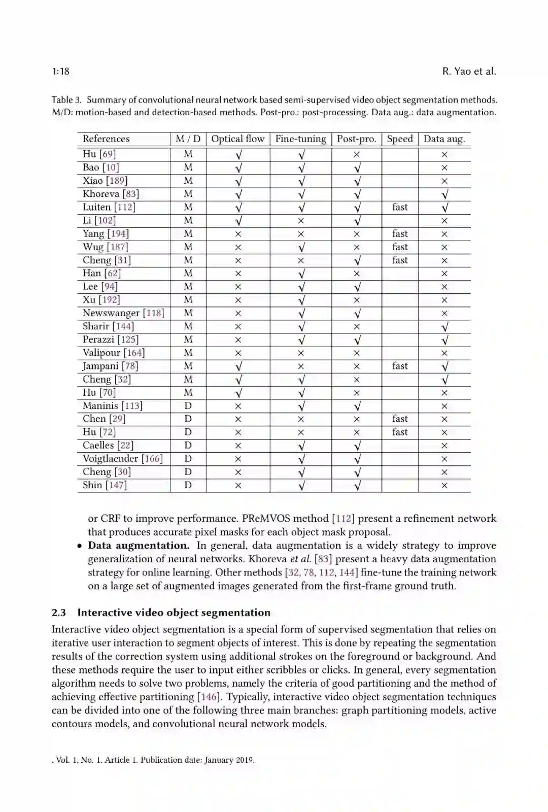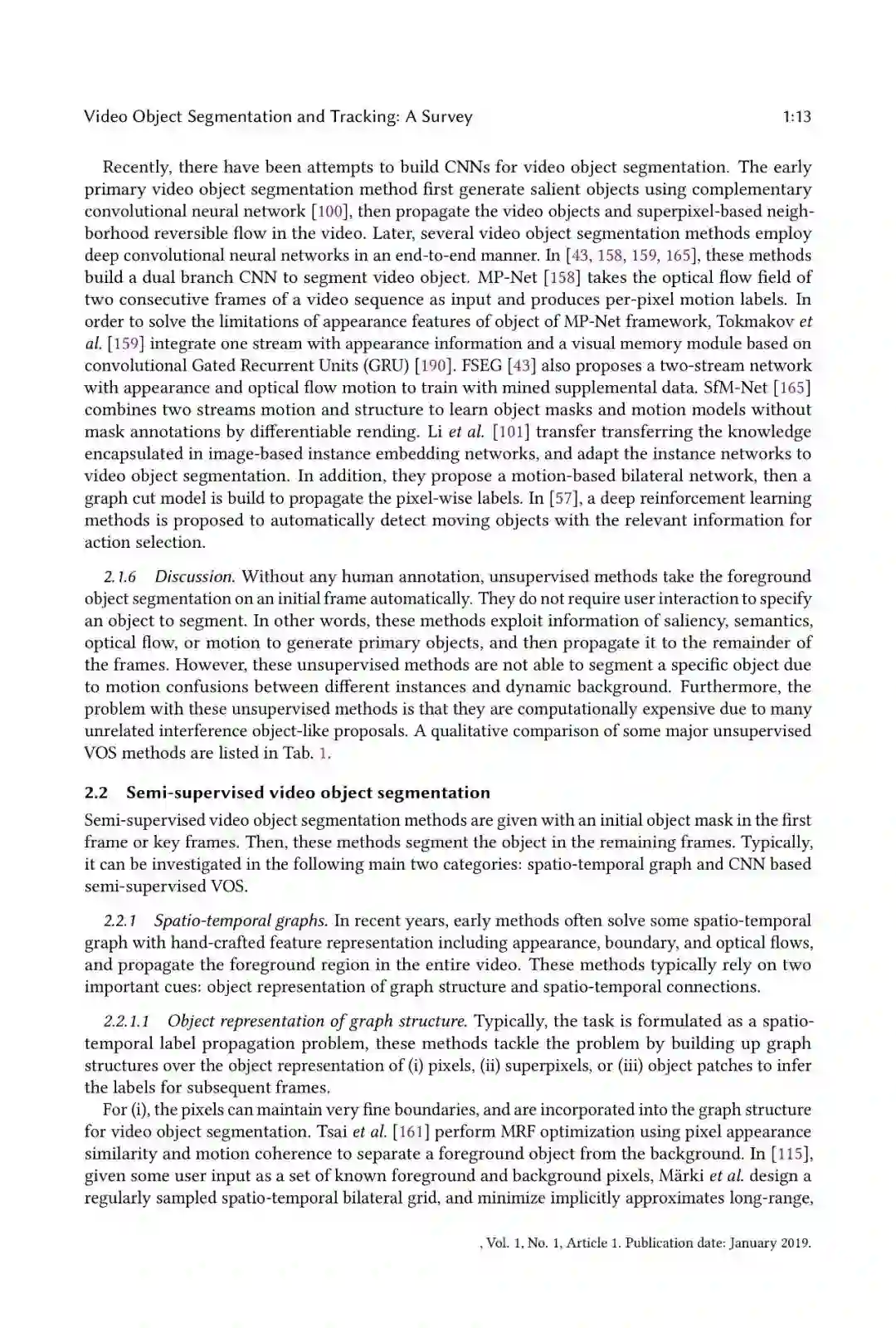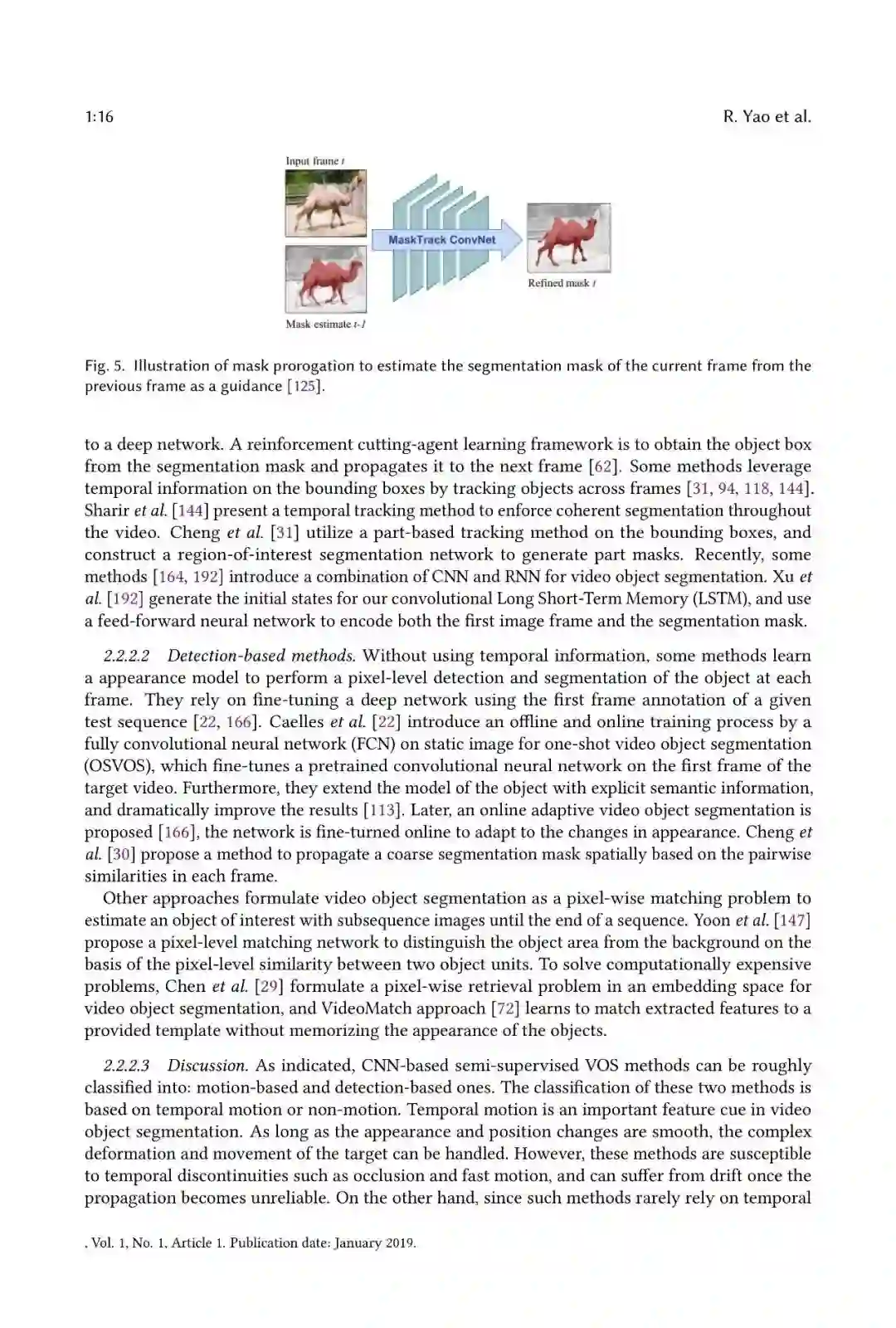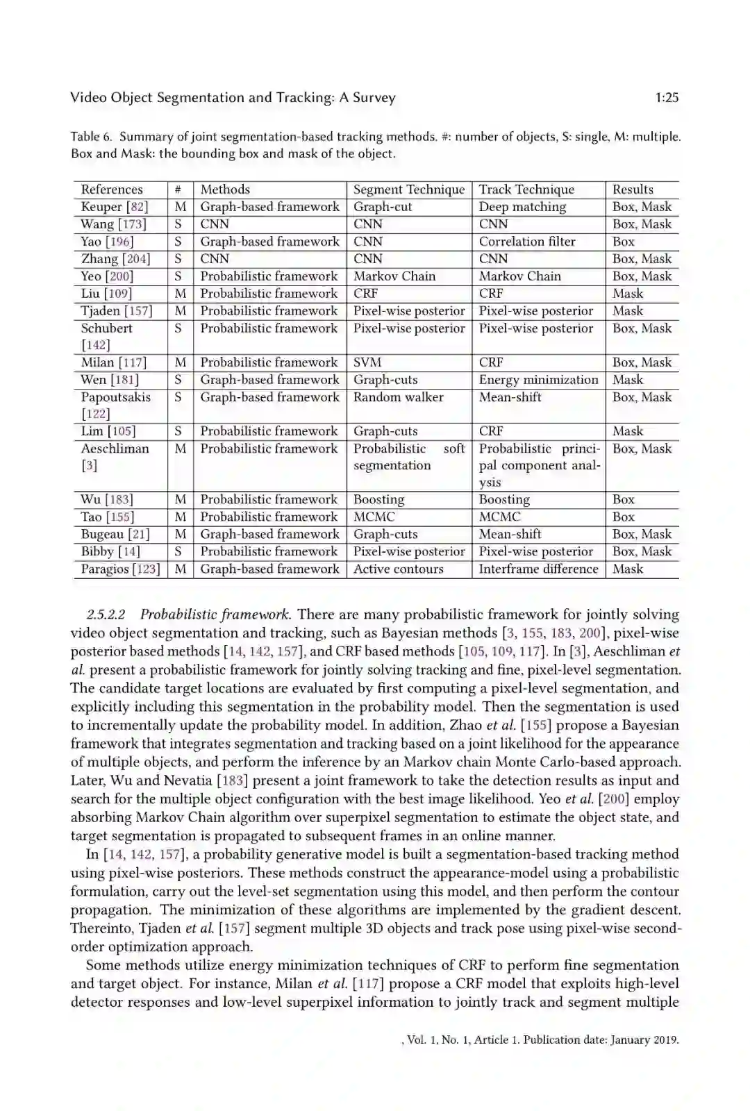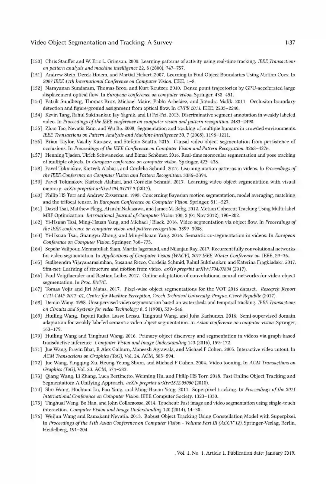 在本文中,我们首先提供了现有的分类法,包括无监督视频对象分割、半监督视频对象分割、基于分段的跟踪方法等;其次,我们讨论了不同技术方法,并总结了相关视频数据集,同时整理了各种评估指标;最后,讨论了此类任务未来的发展方向。