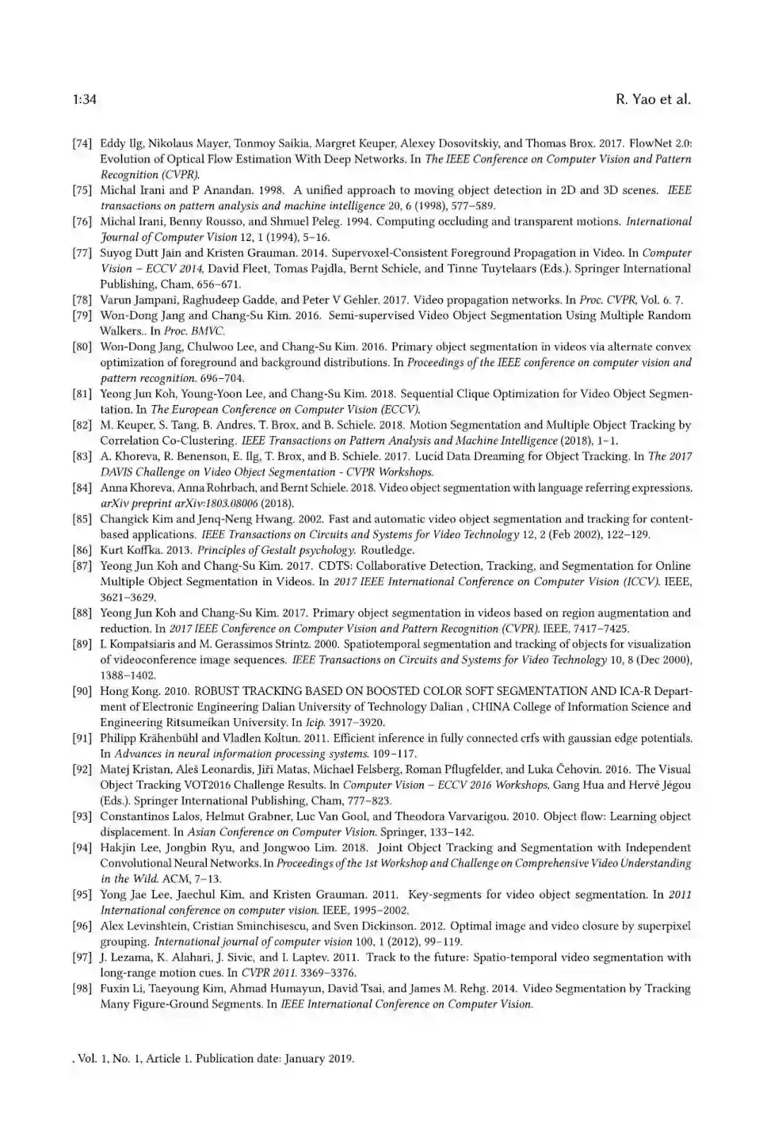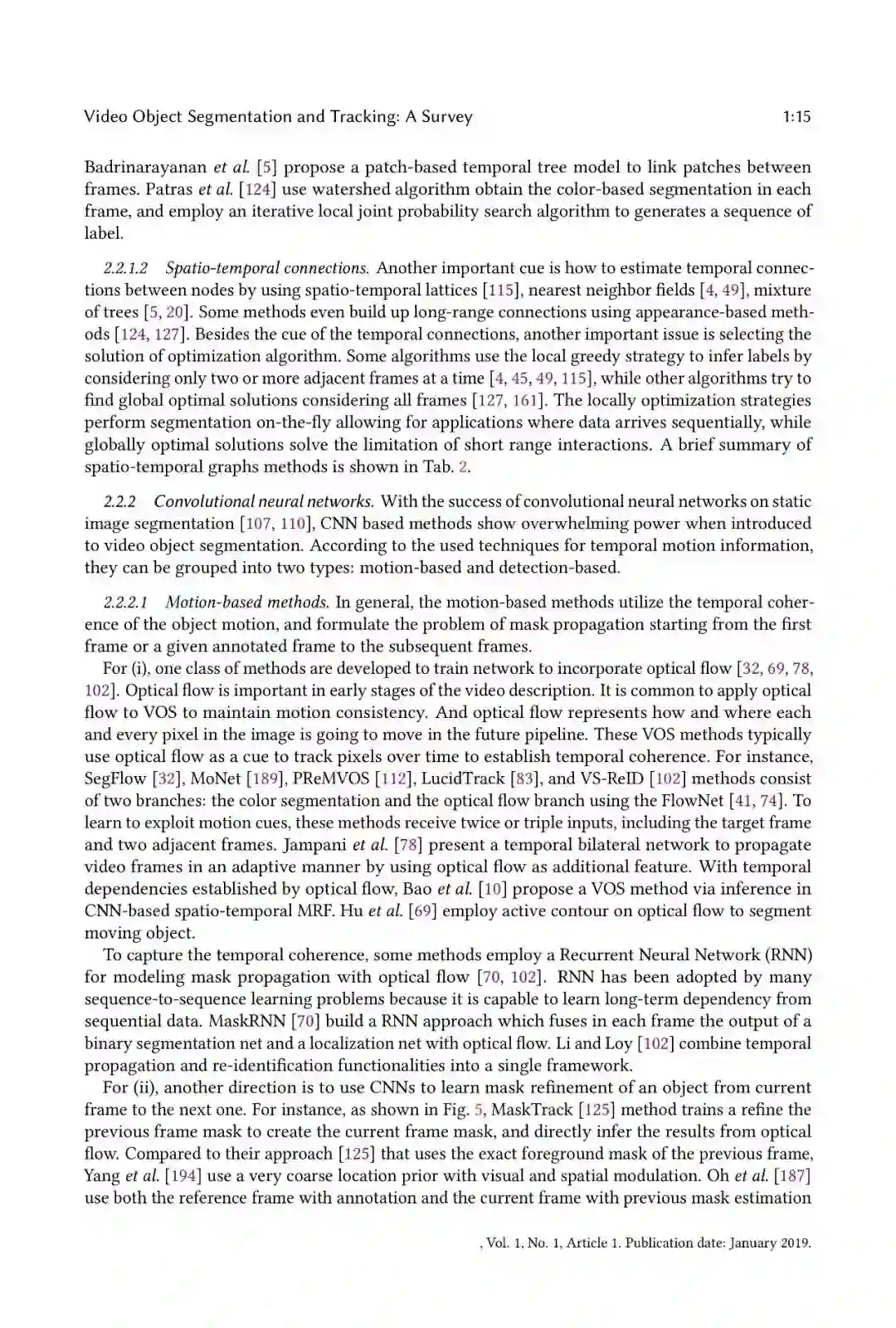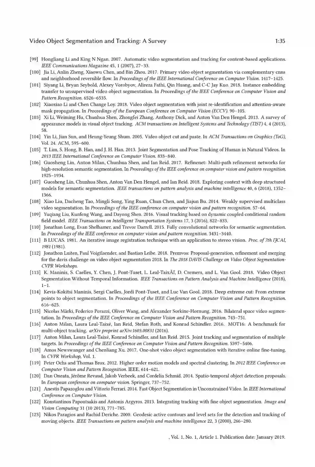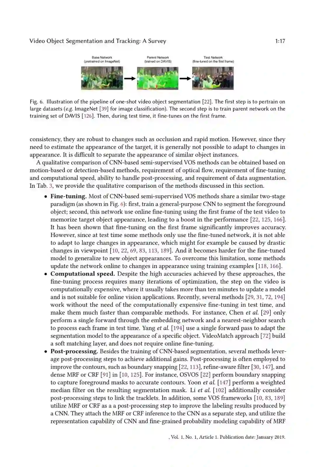 在本文中,我们首先提供了现有的分类法,包括无监督视频对象分割、半监督视频对象分割、基于分段的跟踪方法等;其次,我们讨论了不同技术方法,并总结了相关视频数据集,同时整理了各种评估指标;最后,讨论了此类任务未来的发展方向。