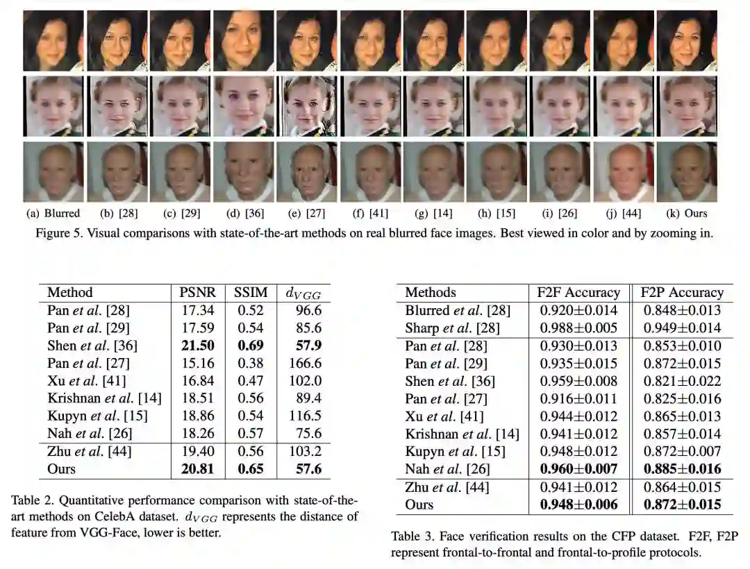 对于 CelebA 数据集,使用来自 VGG-Face 的 pool5 层的输出,对于文本数据集,使用来自 VGG-19 网络的 pool5 层的输出。对于文本去模糊,另一个有意义的度量是去模糊文本的 OCR 识别率。在可视化模型和定量对比上,文章对比了各类模型的去模糊的效果: