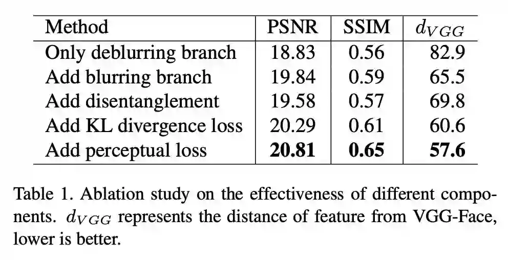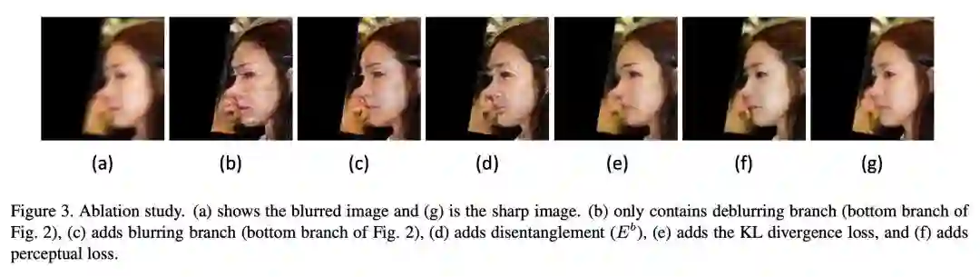文章提出了一种无监督的领域特定单图像去模糊方法。通过解开模糊图像中的内容和模糊特征,并添加 KL 散度损失以阻止模糊特征对内容信息进行编码。为了保留原始图像的内容结构,在框架中添加了模糊分支和循环一致性损失,同时添加的感知损失有助于模糊图像去除不切实际的伪像。每个组件的消融研究显示了不同模块的有效性。