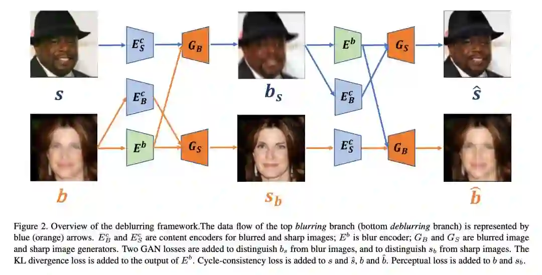 感知损失中使用模糊图像 b 而不是锐利图像作为参考图像有两个主要原因。首先,假设 b 的内容信息可以由预训练的 CNN 提取。其次,由于 s 和 b 未配对,因此在 s 和之间应用感知损失将迫使