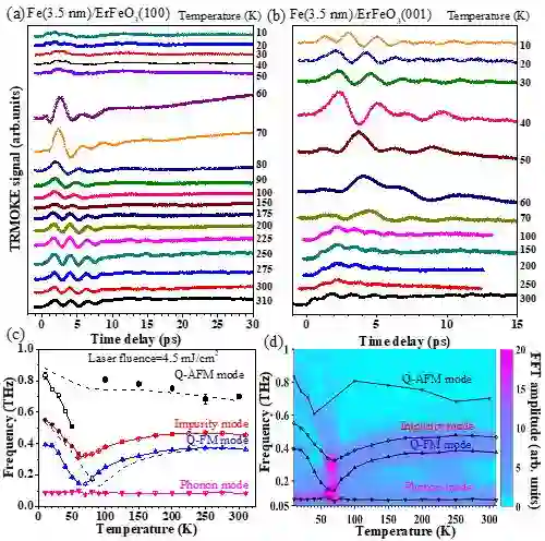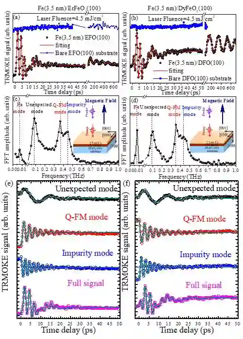 脉冲激光诱导的超快自旋动力学可为研究反铁磁材料提供一个强有力手段,超快脉冲激光泵浦探测(pump-probe)的方法由于具有飞秒时间分辨,可在磁性薄膜超快自旋动力学的研究中得到广泛应用。稀土正铁氧体晶体(orthoferrite)RFeO3(R=Tb, Dy, Ho, Er, Dy, Yb或Y离子) 由于具有复杂的倾斜G型反铁磁结构和强的自旋-轨道-晶格之间的耦合,表现出独特的磁光效应。近年来,超快光磁激发和多铁性等工作中取得的新进展又激发了人们重新研究稀土-铁氧化物的超快磁光效应。