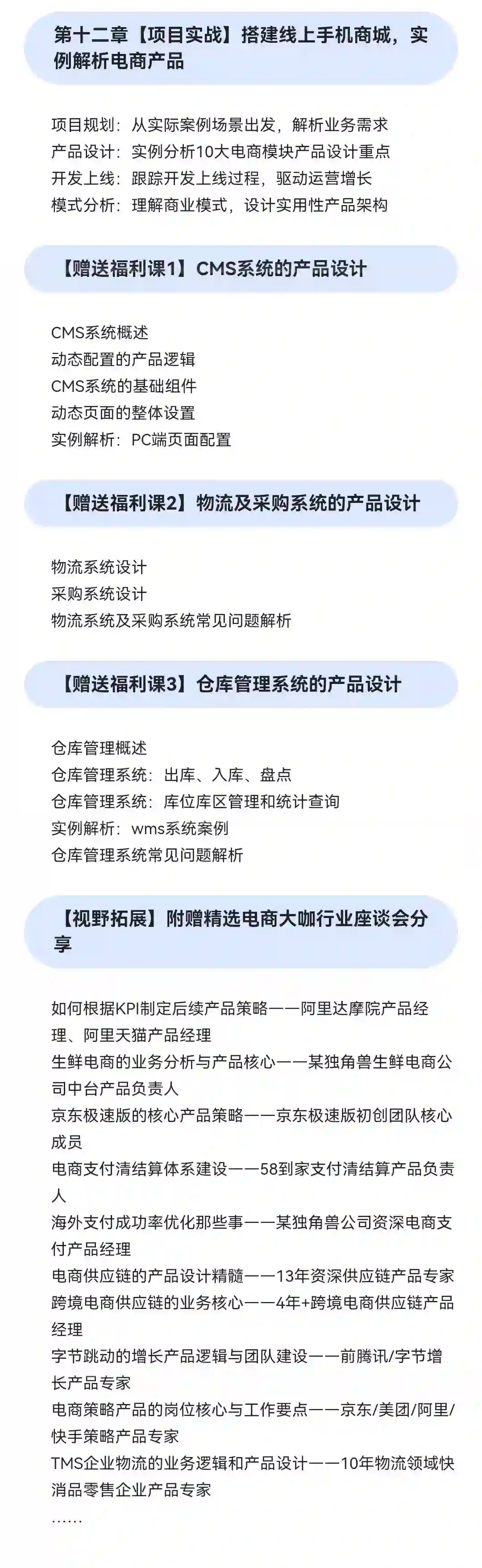 当前网上关于产品的文章主要偏向方法论、业界动向、产品分析、用户体验等,关于电商系统的文章和课程非常少,并且不系统,质量参差不齐。