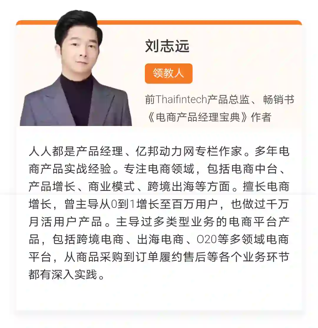 出版了业内第一本电商产品书籍——《电商产品经理宝典》,且垂直领域销量Top 1,现某独角兽公司电商产品总监,其知识体系受到《人人都是产品经理》作者苏杰、滴滴出行产品专家刘飞等大咖认可的@刘志远 老师。