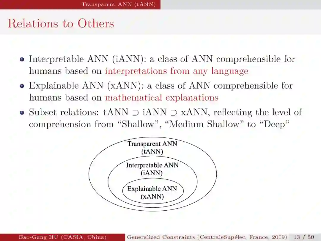 针对目前英文“Interpretable”与“Explainable”对应中文都是“可解释性”,文献中也出现混用情况,我建议将iANN与xANN分别称为“语义可解释神经元网络”与“数学可解释神经元网络”。它们分别对应了“可理解性”中本质上的不同程度。该说法也可以推广到人工智能方法上。这里也可以先想想它们与“透明度”的关联?
