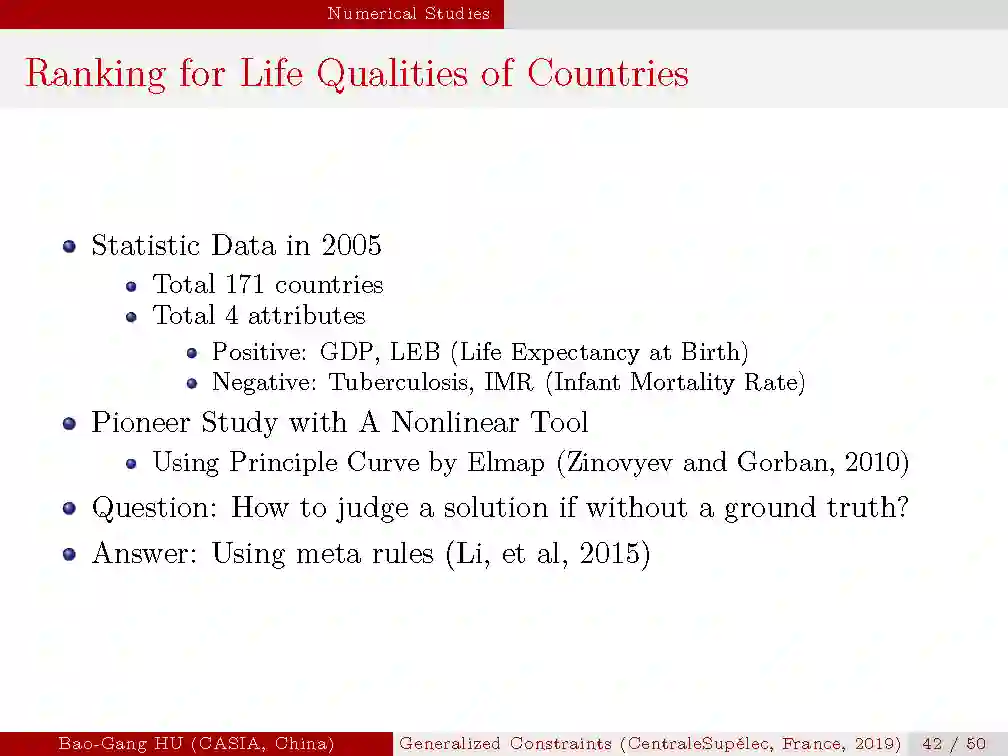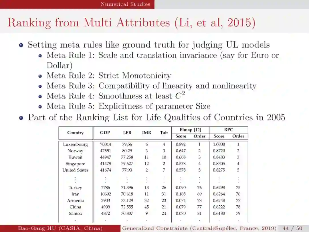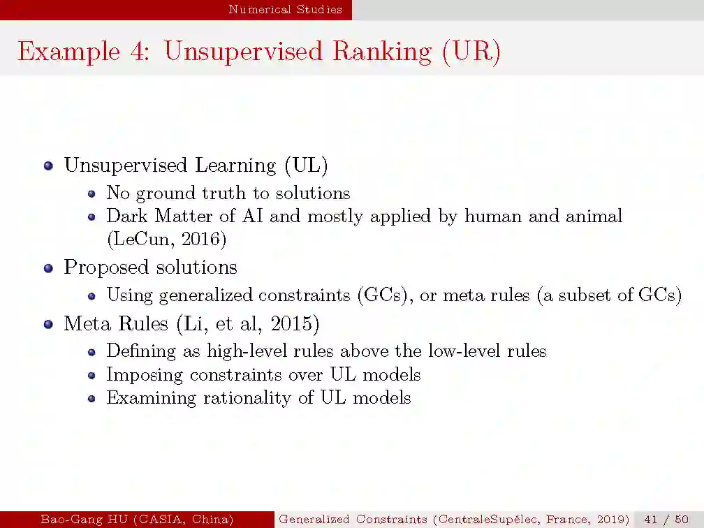 报告给出若干实例,如多属性中的无监督排序。第41页我们试图回答杨乐昆(Yann LeCun) 关于无监督学习为代表的黑物质中可能解决路径,即应用元准则或广义约束来跨越无标准答案的难点问题。要明白无监督学习更需要施加隐藏的知识于模型中,故难于有监督学习。