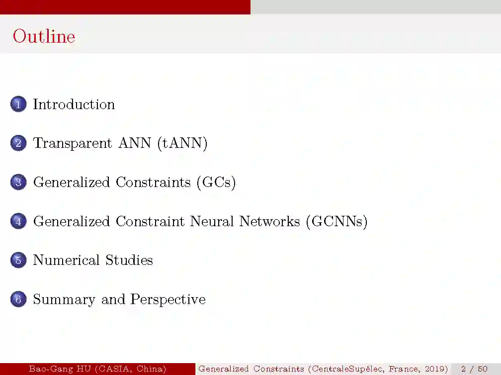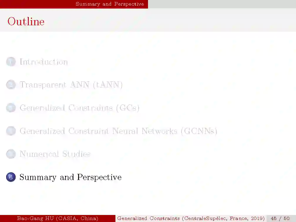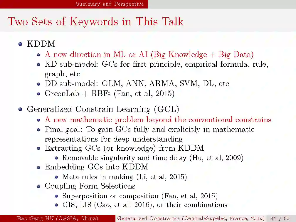 报告第47页总结了本讲座的两组关键词。第一组关键词是知识与数据共同驱动模型方法,这对应了人工智能研究中的一种学术思想。第二组关键词是广义约束学习,将上述思想转化为一种新的数学问题。讲座内容中都有提到两组关键词中相关术语的起源,并给出我们新的见解。希望在介绍森林与树叶,以及源与流之后,讲清我们学术贡献的起点与不同。