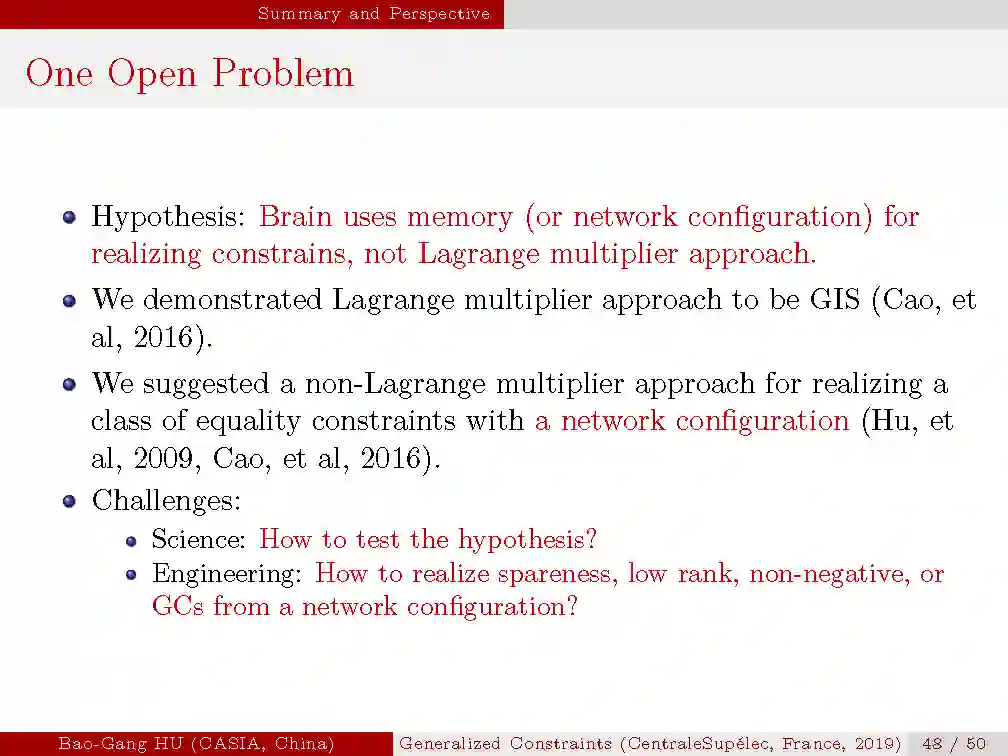 给出未来挑战的具体例子。第48页中内容即是科学问题,又有数学方面问题。如若应用网络结构方式,而非拉氏算子方式实现低秩,稀疏,非负等均束优化学习将是机器学习或类脑研究中的一大突破。