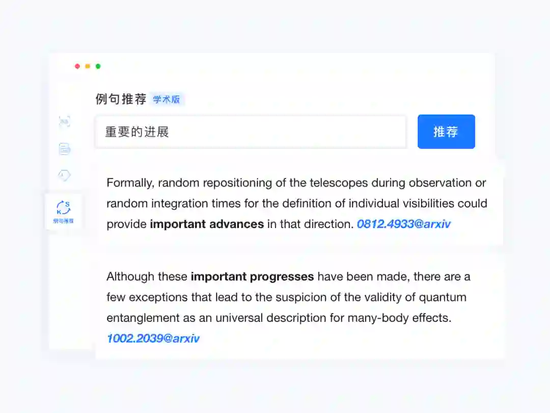 图10:跨语言例句检索。输入中文、英文或者中英文混合的关键词,系统返回现有公开发表的论文中包含这些关键词的英文句子作为例句。