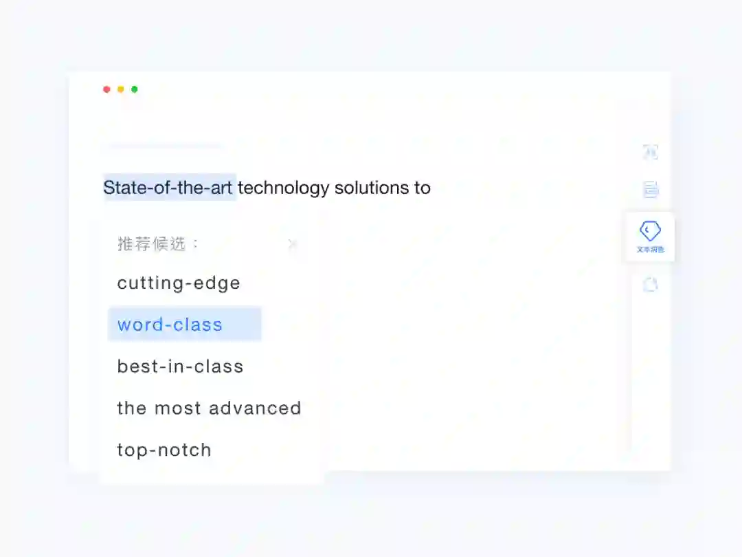 在满足内容表达正确基础上,文涌提供多样化的文本润色服务,包括短语润色、句子改写、句子扩写三种方式,辅助用户提升文本表达的质量。