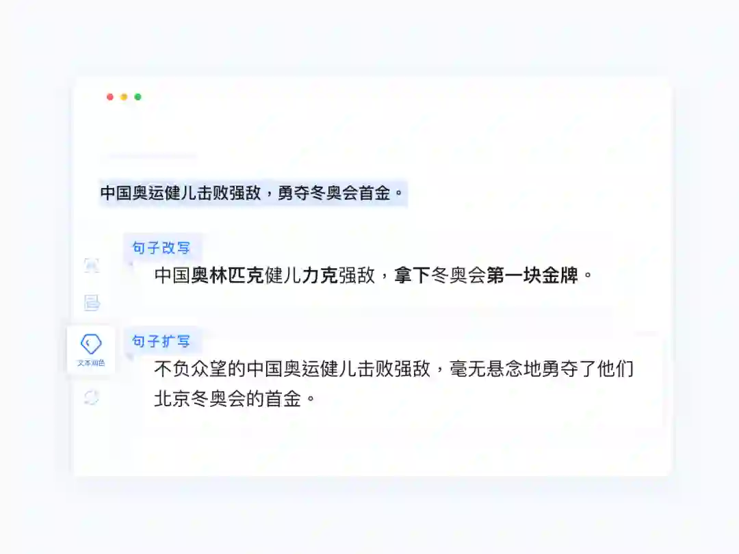 针对长句,文涌可提供同义改写和扩写两种改写方式。其中,在句子扩写的过程中,文涌会自动判别所选中区域的主干文本,针对主干文本内容进行修饰和扩充。如下图例子,文涌在保持句子语义一致性的基础上,分别修饰句子各成分,进行合理的内容发散。