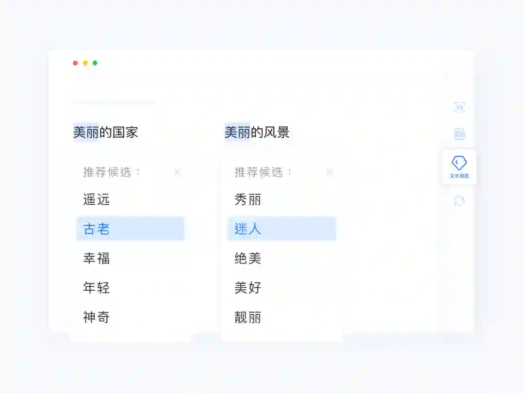 不同于简单的同义词替换,文涌的短语润色服务能够结合当前短语的上下文信息,提供满足当前语境的合理润色方案。如下图所示,「美丽」一词在不同的语境中,短语润色给出不同结果。在关联上下文的基础上,文涌短语润色功能的触发率高于大多数同类系统,即文涌能够对句子中更多的短语给出润色结果。