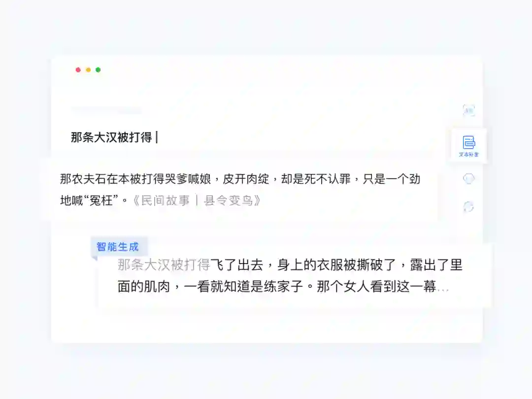 文涌为写作者提供不同粒度和不同维度的文本补全能力,包括短语补全、检索式句子补全、AI 自动续写三种方式,启发写作者思路、提高写作效率。