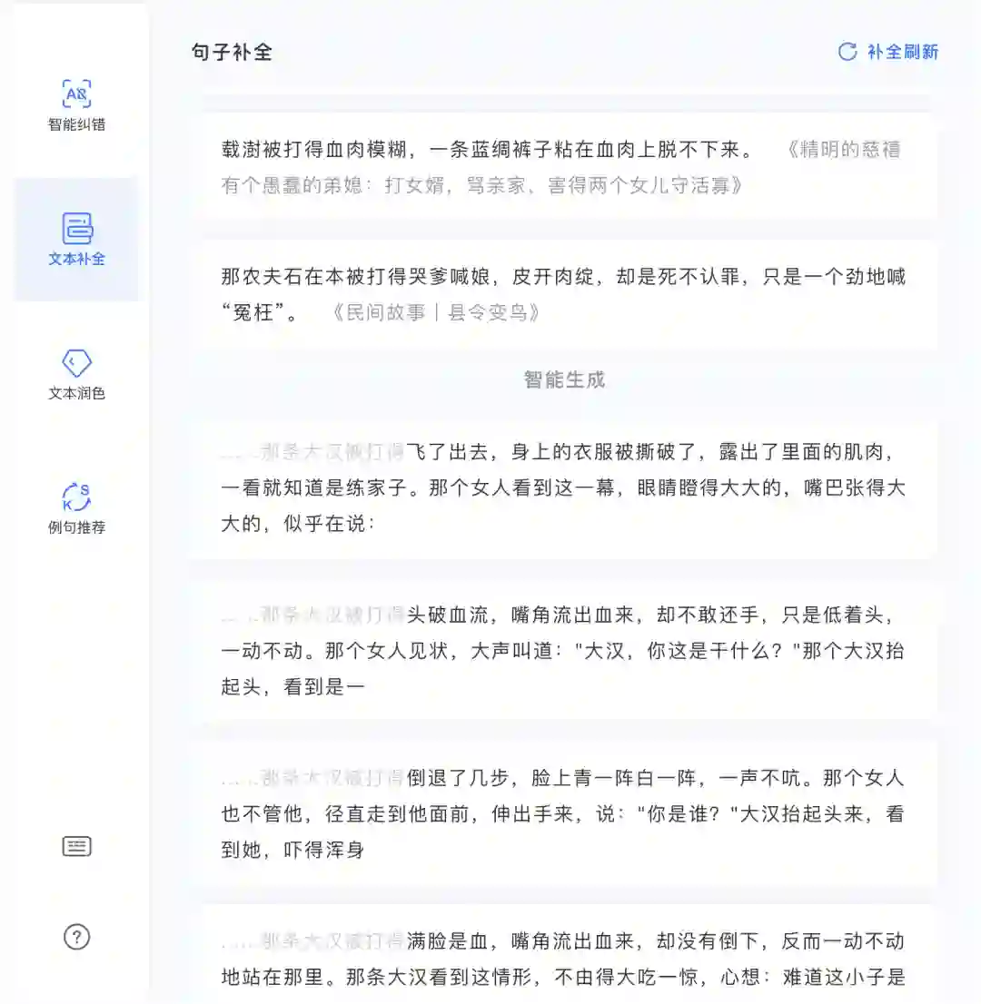 同时,文涌还提供两种句子级别续写方式:检索式句子补全和基于语言模型的 AI 自动续写,为写作者提供多维度的写作提示。下图例子中,给定输入前缀「那条大汉被打得」时,两种方式均能给出合理流畅的续写结果。