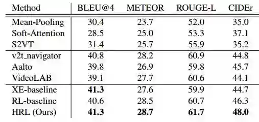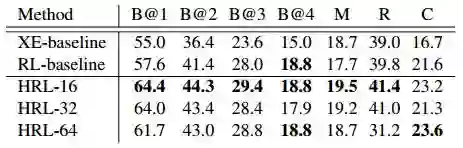 表2:Charades数据集上的结果。我们分别记录了我们的HRL模型以及两个基准方法的不同得分:包括BLEU(B),METEOR(M),ROUGH-L(R)和CIDEr(C)等得分。