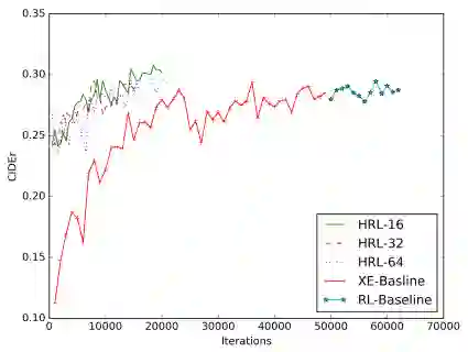 图6:不同视频描述模型的CIDEr分值的学习曲线。包括XE基准模型,RL基准模型和HRL模型分别在目标尺寸为16,32, 64条件下。