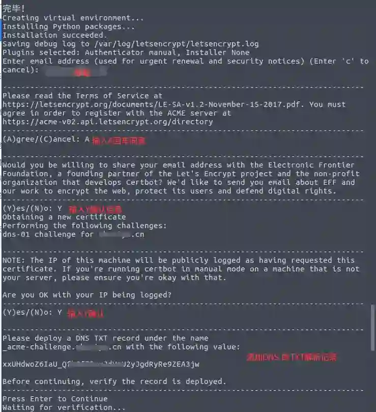 注意,申请通配符证书是要经过DNS认证的,按照提示,前往域名后台添加对应的DNS TXT记录。添加之后,不要心急着按回车,先执行dig xxxx.xxx.com txt确认解析记录是否生效,生效之后再回去按回车确认