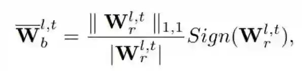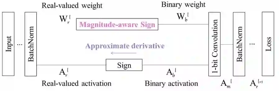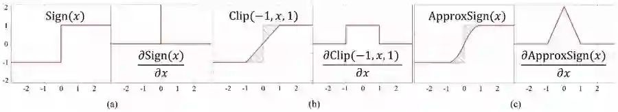 (2)而在对二值化参数进行更新的时候,由于二值化参数是离散的,导数值太小往往不足以改变它的符号,因此前人采用的方法是存储实数值的参数,在更新的时候将网络根据二值参数计算出来的导数更新实数值参数,在正向传播过程中,用 sign 将实数值参数二值化,得到更新后的二值化参数。