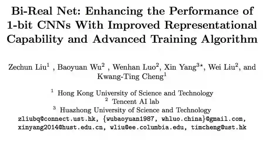 这项工作由香港科技大学,腾讯 AI lab,以及华中科技大学合作完成,目的是提升二值化卷积神经网络(1-bit CNN)的精度。虽然 1-bit CNN 压缩程度高,但是其当前在大数据集上的分类精度与对应的实值 CNN 相比有较大的精度下降。本文提出的 Bi-Real net 用 shortcut 传递网络中已有的实数值,从而提高二值化网络的表达能力,并且改进了现有的 1-bit CNN 训练方法。试验结果表明,18 层 Bi-Real net 在 imagenet 数据集上达到 56.4%的 top-1 分类精度,比 baseline XNOR Net 相对高了 10%。并且更深的 34 层 Bi-Real net 达到了 62.4%的 top-1 分类精度。