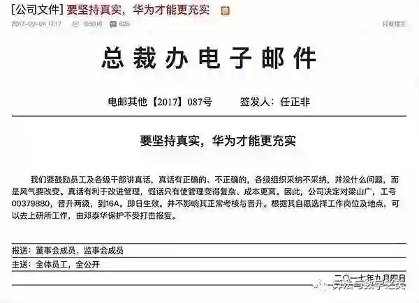 前不久,华为一份总裁办电子邮件从内部流出,引发强烈的舆论反响。一位名为“梁山广”的华为员工,冒着“混不下去”的风险,揭发了所在部门的造假行为,出其意料的是,最后他被任正非破格提拔两级。为免其在公司内部受到打击报复,任正非还指定华为无线产品线总裁邓泰华对其进行保护。