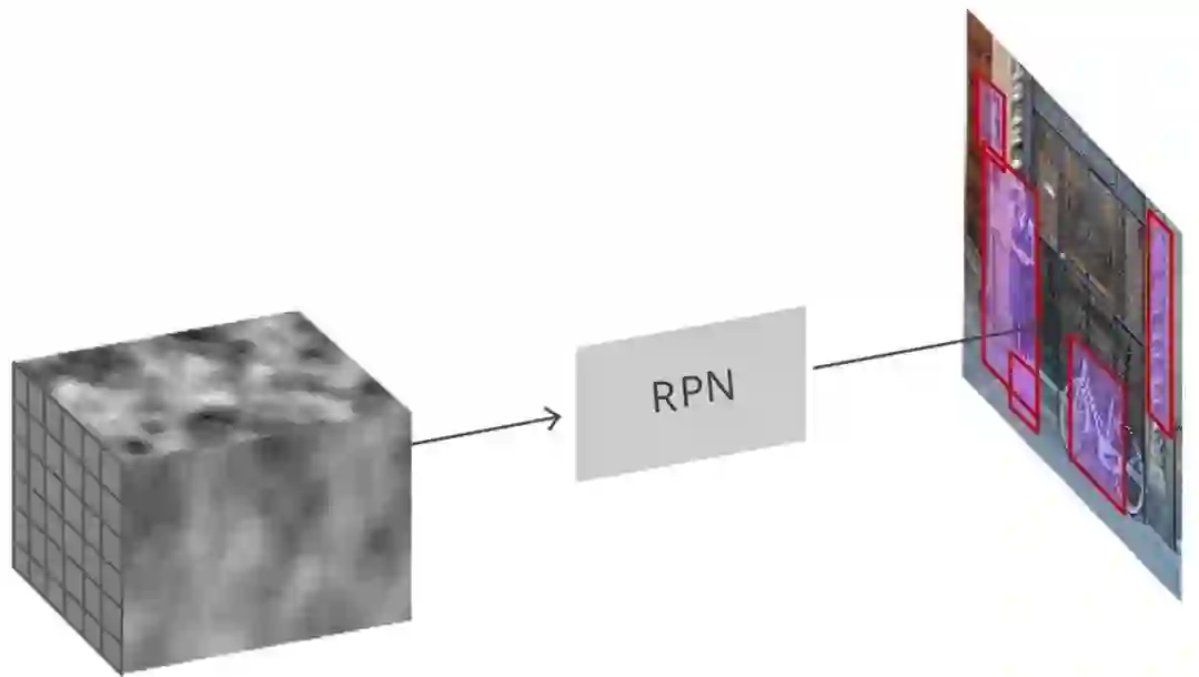 输入的图片以长×宽×高的张量形式表征,之后会被馈送入预训练好的卷积神经网络,在中间层得到特征图。使用该特征图作为特征提取器并用于下一流程。