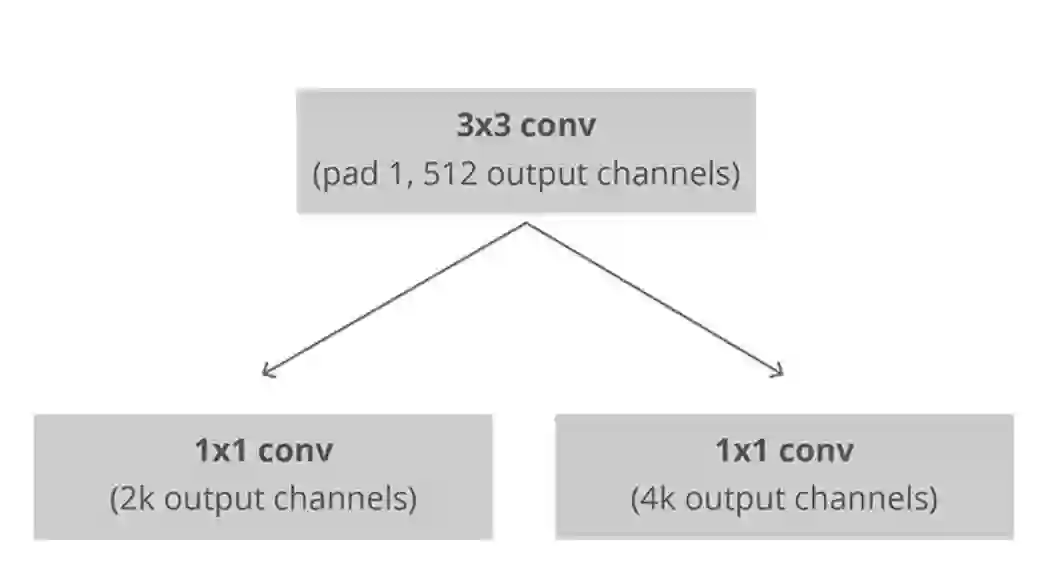 RPN 是用完全卷积的方式高效实现的,用基础网络返回的卷积特征图作为输入。首先,我们使用一个有 512 个通道和 3x3 卷积核大小的卷积层,然后我们有两个使用 1x1 卷积核的并行卷积层,其通道数量取决于每个点的锚点数量。