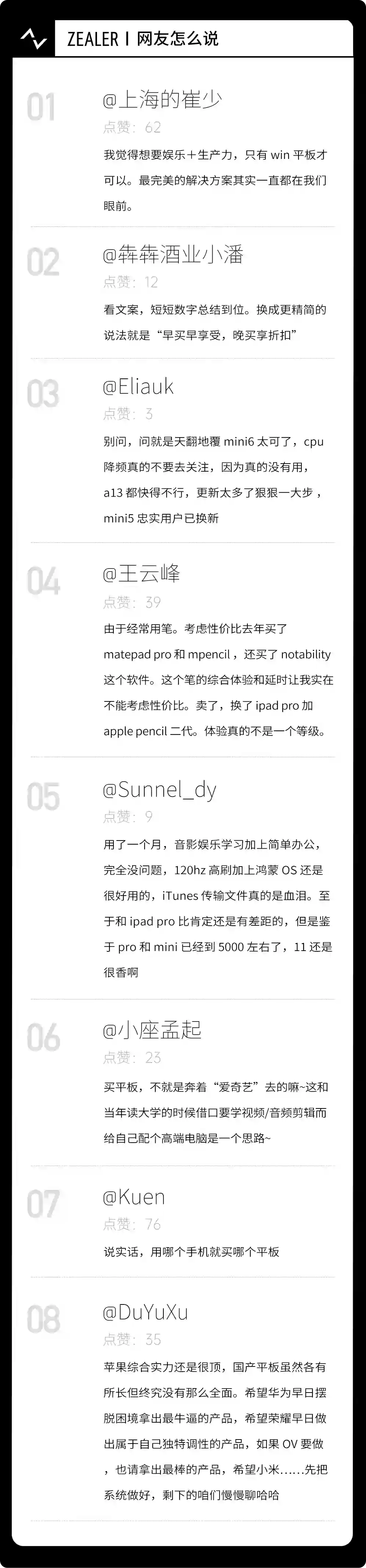 小 Z 筛选了几条观点鲜明的网友评论,大家的评论很有趣,也挺专业的,其实目前平板电脑市场逐渐趋于饱和,平板电脑的特点很明显,缺点更明显。大部分用户购买平板电脑只是那些“凑合一下得了”的需求:不想用电视看极致画质的视频,那就用平板凑合一下;不想用电脑办公,那就用平板凑合一下;没必要买游戏机和游戏电脑,再用平板凑合一下。