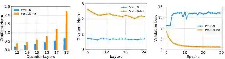 作者接下来在 IWSLT-14 De-En 机器翻译数据集上面训练了 18L-18L Post-LN 和 18L-18L Post-LN-init。如下图1所示是它们的梯度和 validation loss 的曲线。如图1(c) 所示,Post-LN-init 的 validation loss 是收敛的,但是 Post-LN 却没有。如图1(a) 所示,Post-LN-init 在最后几层中具有更大的梯度范数,尽管其权重已按比例 缩小。这说明梯度爆炸不是导致 Transformer 训练不稳定的原因。如图1(b) 所示,作者可视化最后一个解码器层的梯度范数,模型深度从 6L-6L 到 24L-24L,发现 Post-LN-init 的梯度范数大于 Post-LN 的梯度范数,但是初始化时 Post-LN-init 的范数是更小的。