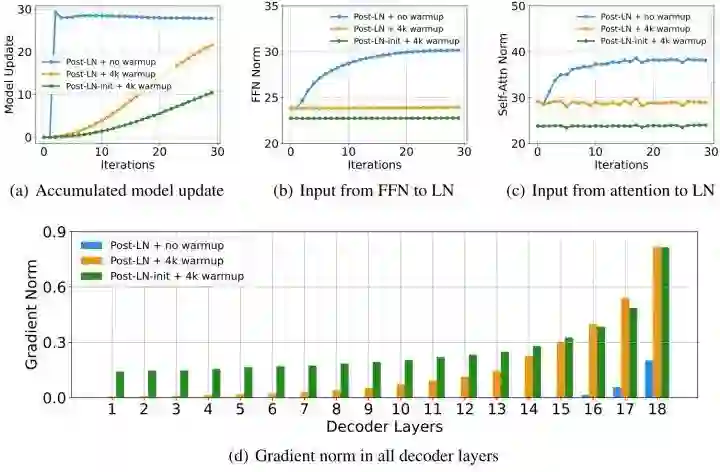 式中, 和 代表第 次更新的输入和模型参数。Post-LN 在训练一开始就有爆炸式的更新,然后很快就几乎没有更新了。这表明该模型已陷入虚假的局部最优。warm-up,或者更好的初始化都有助于缓解这个问题,使模型能够更加顺利地更新。图2(b)和(c)分别是从 FFN 层和 Attention 层到 LN 层的输入,作者发现当更新爆炸时,LN 的输入会变大。对于这种现象,之前已有理论分析: