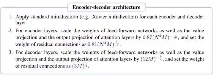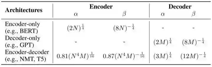 4 DeepNorm 还在初始化期间 down-scale 了参数。值得注意的是,对于 ffn,v_proj,out_proj 和 q_proj,k_proj 的初始化,是不一样的。5 不同架构的 α 和 β 值不一样,如下图所示。