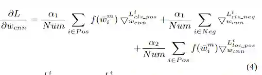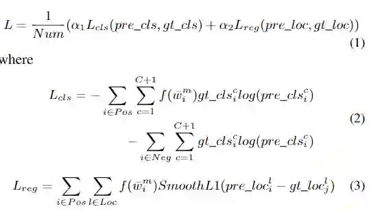 样本加权损失L由用于边界框分类的损失Lcls和用于边界框回归的损失Lreg组成,Lcls使用softmax损失函数而Lreg使用L1平滑损失实现。