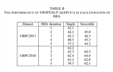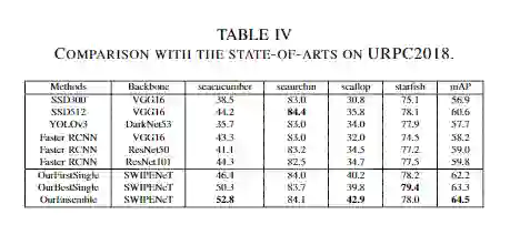 在两个水下机器人拾取竞赛数据集URPC2017和URPC2018进行的实验表明,与几种最先进的目标检测方法相比,本文提出的SWIPENet+IMA框架在检测精度上取得了较好的性能。