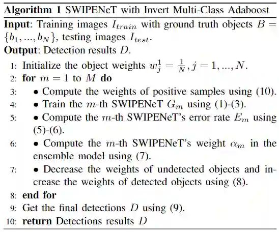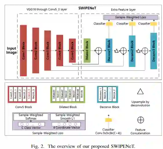 为了解决小目标检测和噪声这两个问题,本文首先提出了一种新颖的神经网络架构,即用于小物体检测的样本加权混合网络(SWIPENet)。SWIPENet由高分辨率和语义丰富的超特征图组成,可以显著提高小物体检测的准确性。此外,提出了一种新的样本加权损失函数,该函数可以为SWIPENet建模样本权重,它使用一种新颖的样本重新加权(Sample re-weighting)算法,即Invert Multi-Class Invert Adaboost(IMA),以减少噪声对提出的SWIPENet的影响。