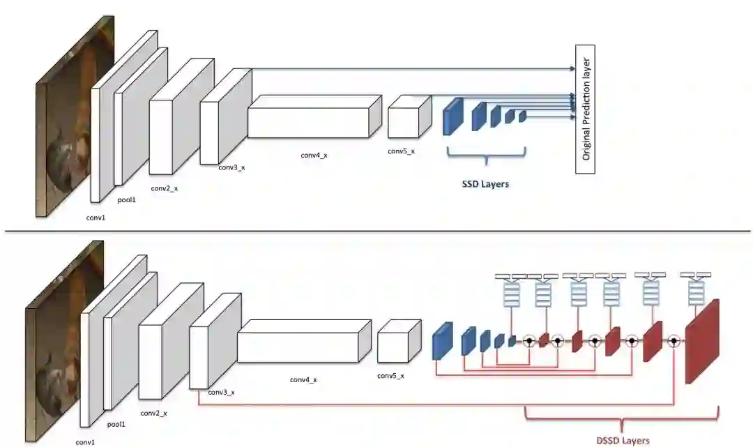 可以看出,DSSD通过多个上采样反卷积层增强了SSD目标检测框架,以提高特征图的分辨率。在DSSD体系结构中,首先,构造多个下采样卷积层以提取有利于对象分类的高语义特征图。经过几次下采样操作后,特征图太粗糙而无法提供足够的信息来进行精确的小对象定位,因此,添加了多个上采样反卷积层和skip connection来恢复特征图的高分辨率。但是,即使恢复了分辨率,下采样操作丢失的详细信息也无法完全恢复。
