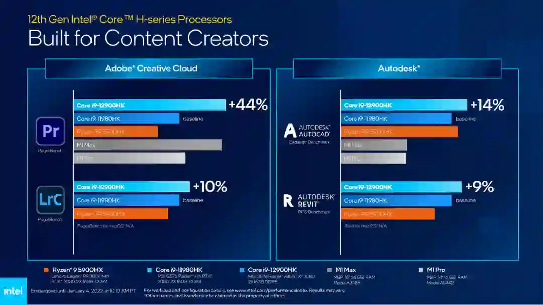 英特尔表示,所有主要合作厂商的 100 多种设计需求都会采用 Alder-H 系列,功率从 35W 到 65W 不等。在高端性能方面,与上一代(Core i9-11980HK)和竞品(包括 Ryzen R9 5900HX 和 M1 Max)相比,Core i9-12900HK 在 1080p 高画质下的游戏性能可提升 28% ,在 Adobe Creative Cloud 内容创建表现上也提升 44%。