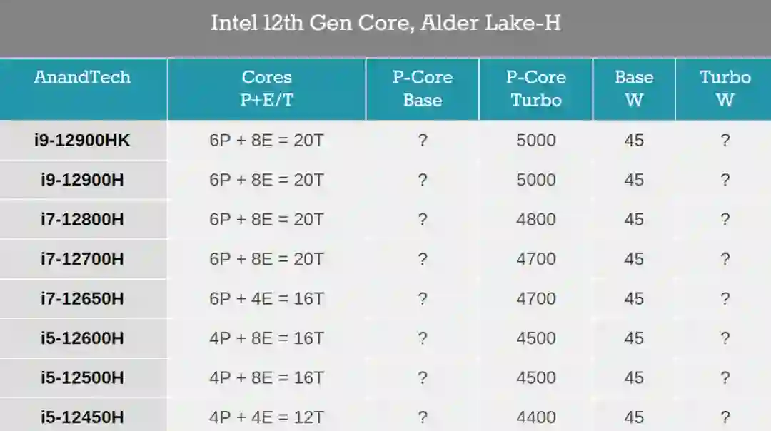 酷睿 Alder Lake-H 系列提供了 8 种型号,目前已公布了核心数、缓存大小、峰值频率和基本功率,但缺少峰值功率和基础频率的信息。